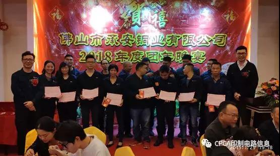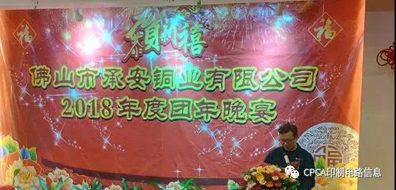 2019年1月29日晚,佛山市承安銅業(yè)有限公司在公司行政樓隆重舉行2018年度團年晚宴;周騰芳董事長(cháng)、周建新總經(jīng)理、岑國明副總經(jīng)理及公司全體員工參加了團年晚宴;中國電子電路行業(yè)協(xié)會(huì )(CPCA)顧問(wèn)梁志立高工、廣東省電路板行業(yè)協(xié)會(huì )副秘書(shū)長(cháng)陳世榮副教授等嘉賓也參加了晚宴。